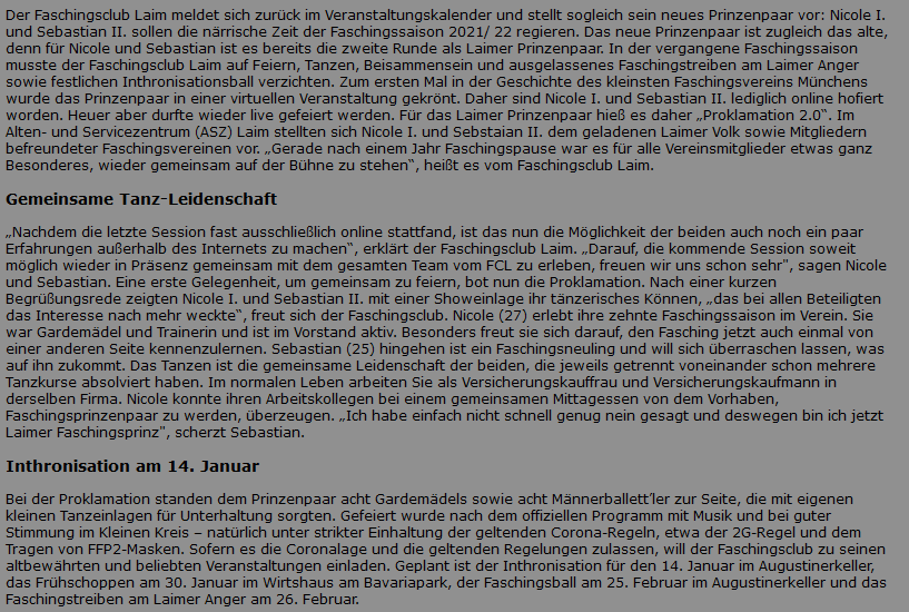 Inthronisation 2.0 - Faschingsclub Laim mit Prinzenpaar 2021/2022 Nicole I und Sebastian II